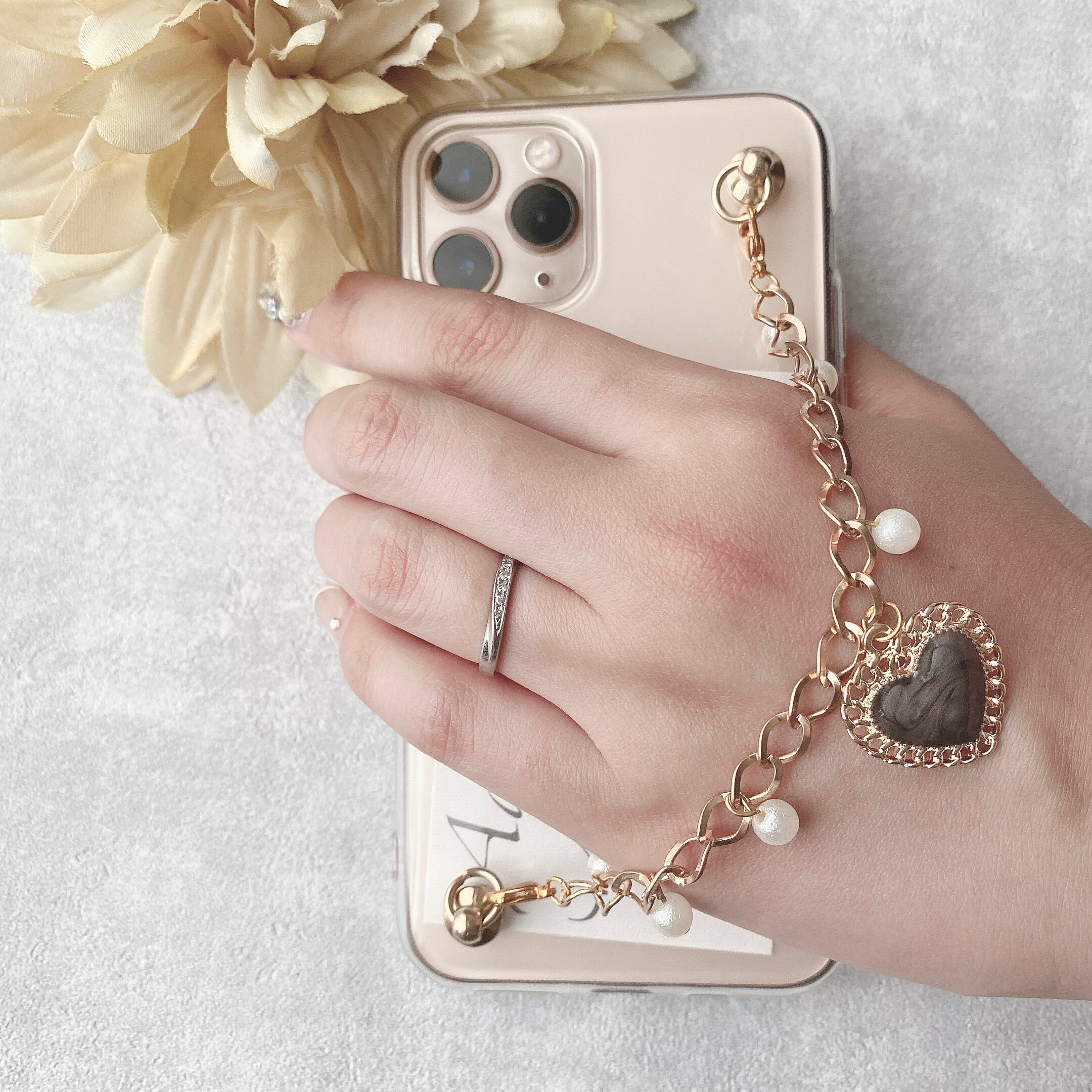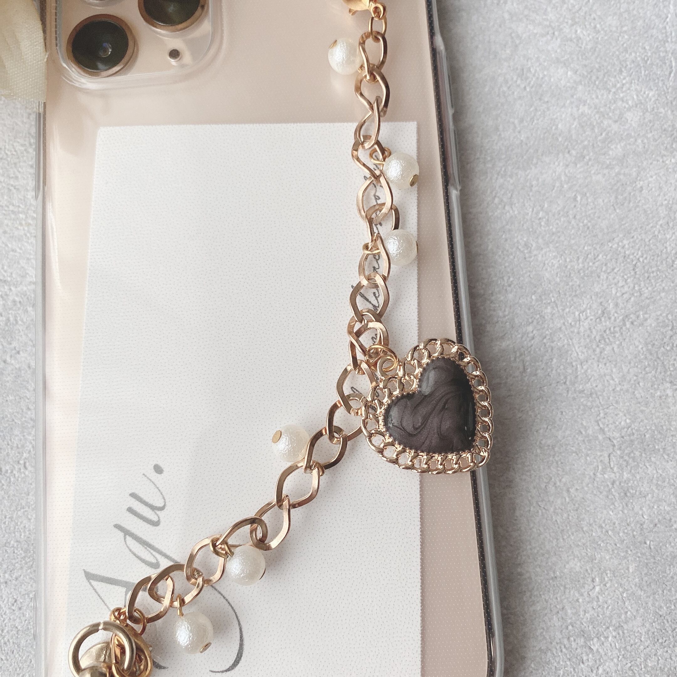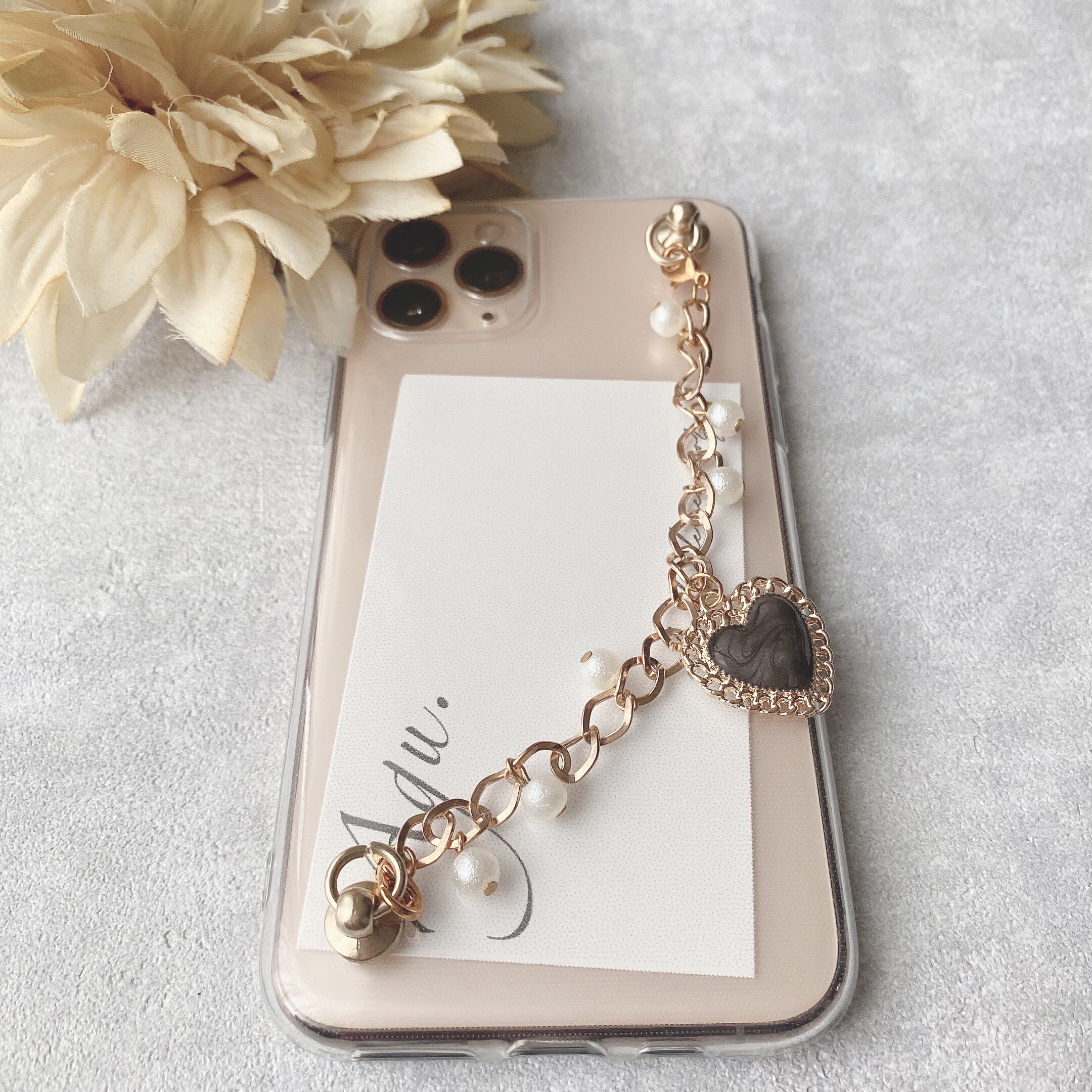 【iPhone】ゴールドハートチャームのキーリングハンガー(ブラック)