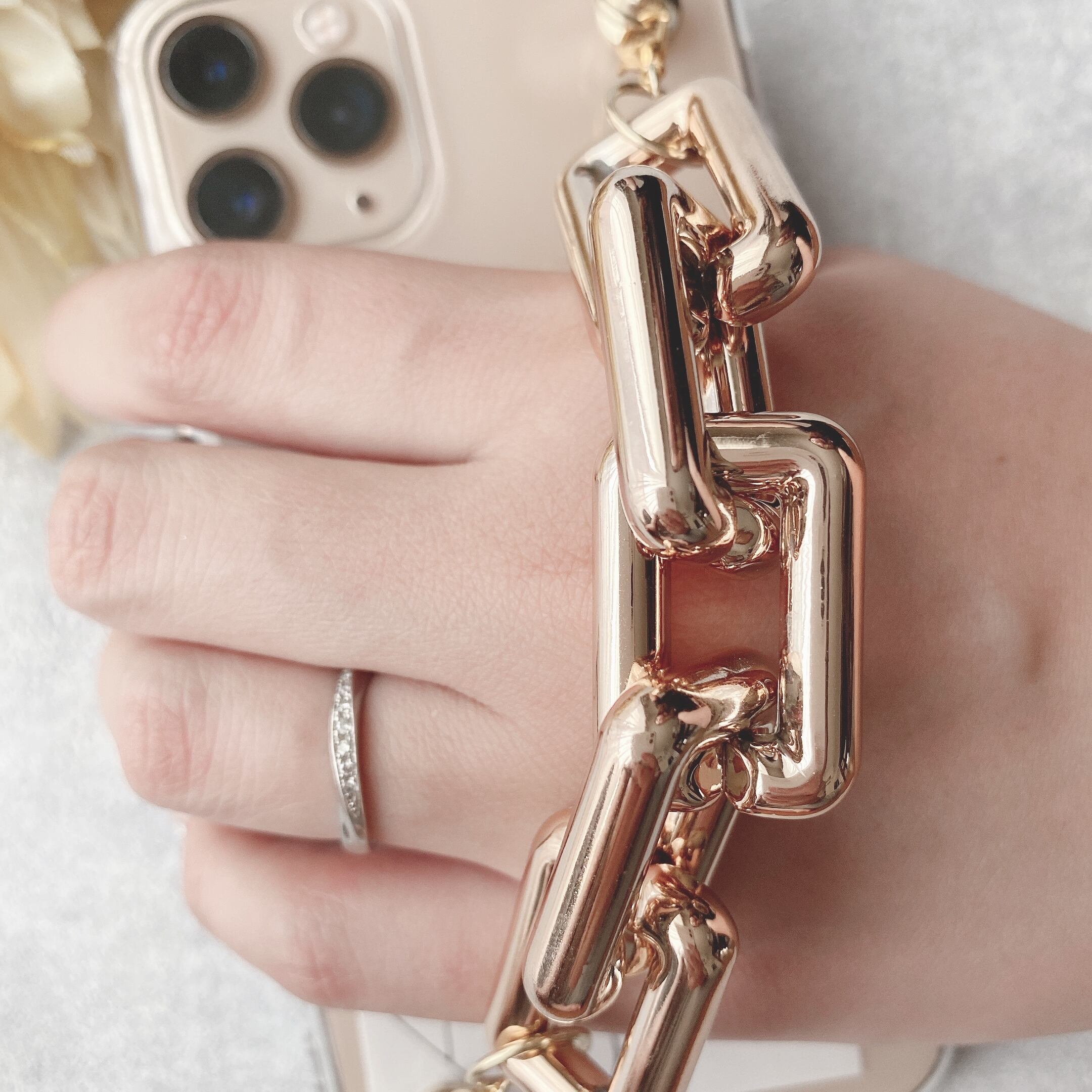 【iPhone】大ぶりスクエアチェーンのキーリングハンガー(ゴールド)
