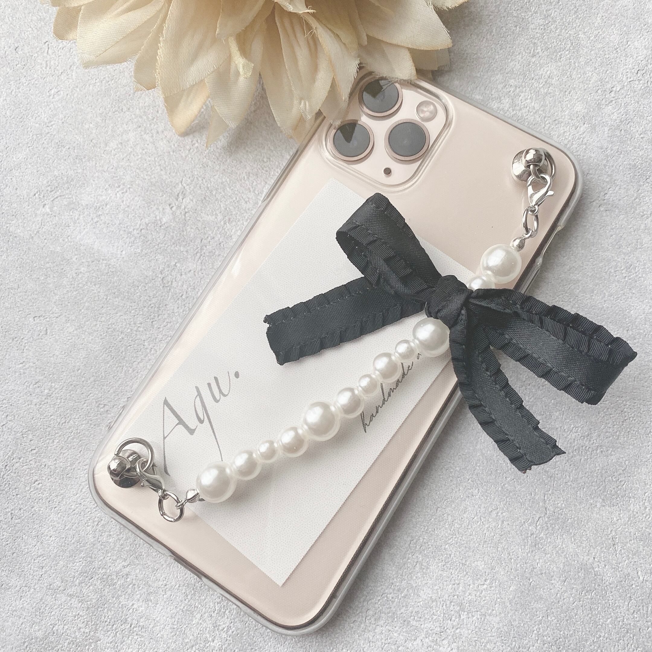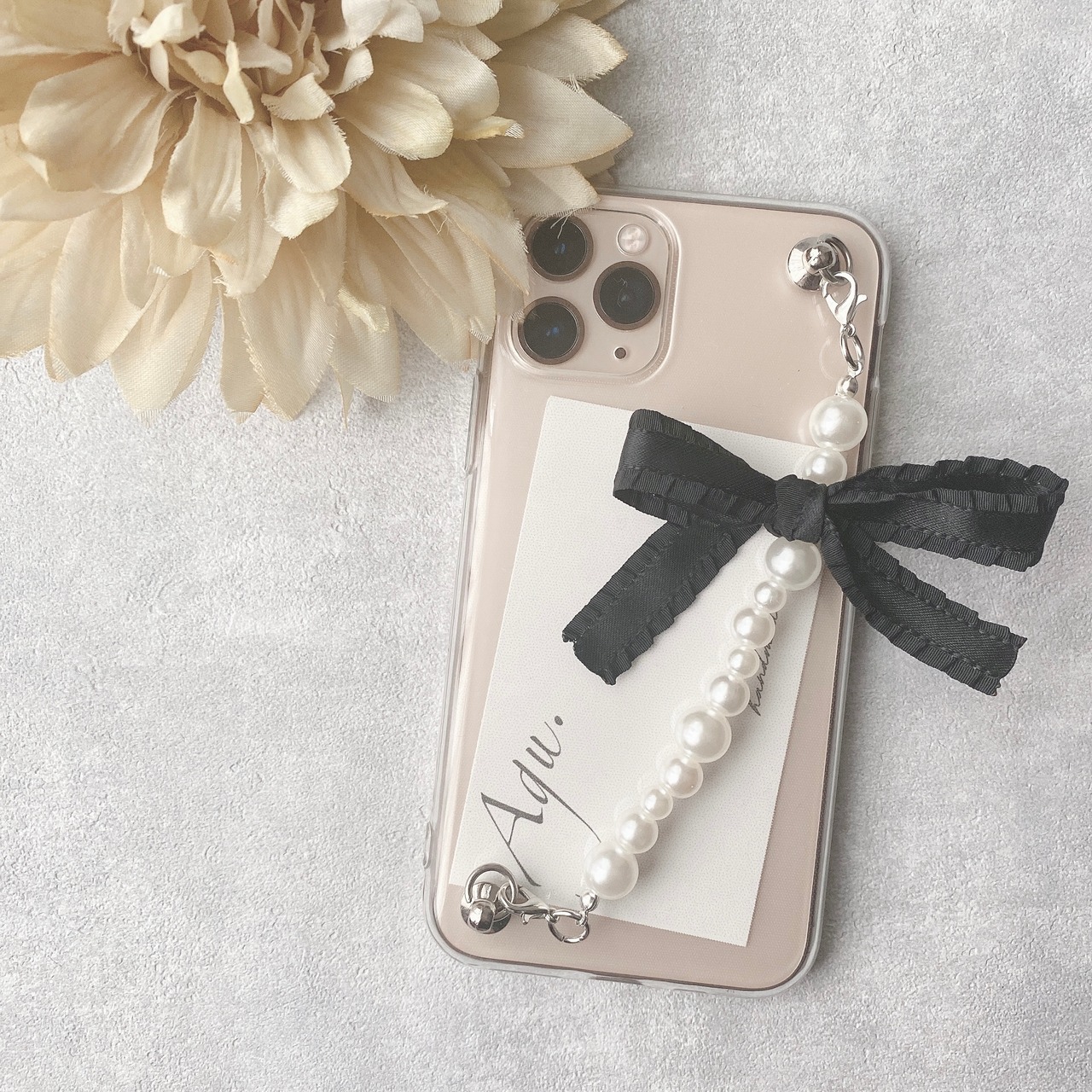 【iPhone以外】ブラックリボンとパールチェーンのキーリングハンガー