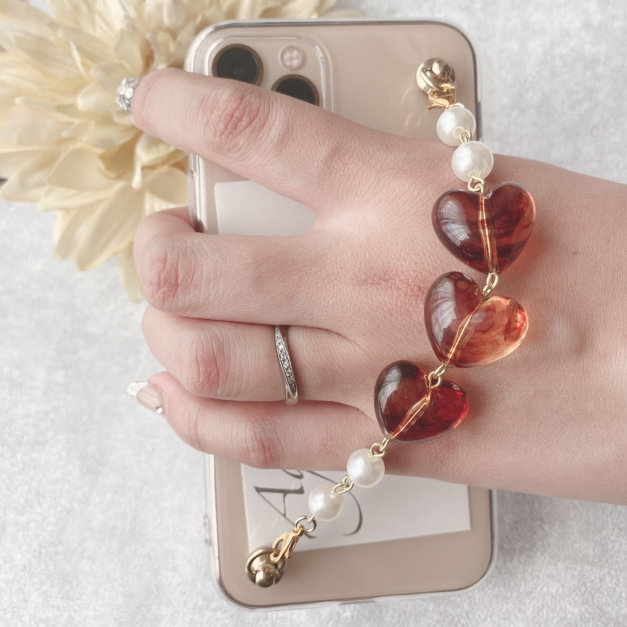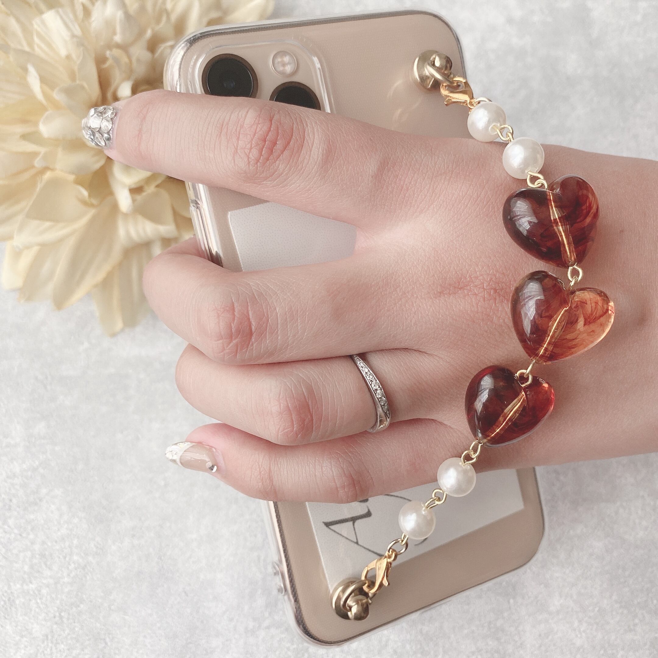 【iPhone】3連ハートのキーリングハンガー(べっ甲)