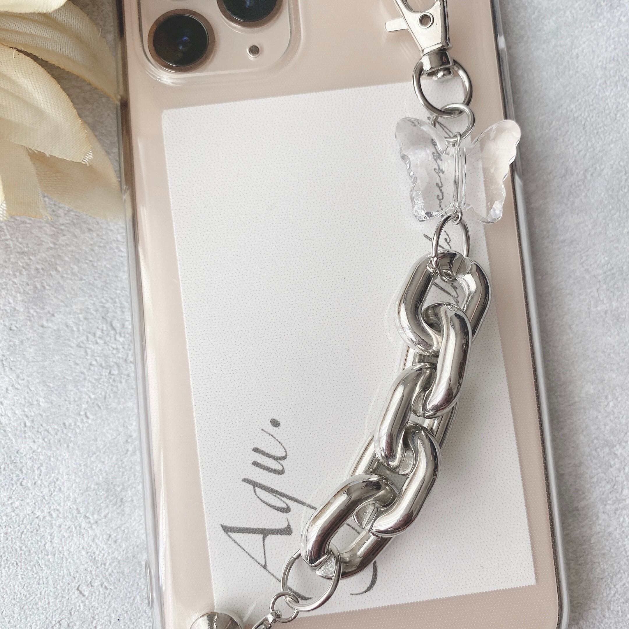 【iPhone】クリア蝶々とシルバーチェーンのキーリングハンガー