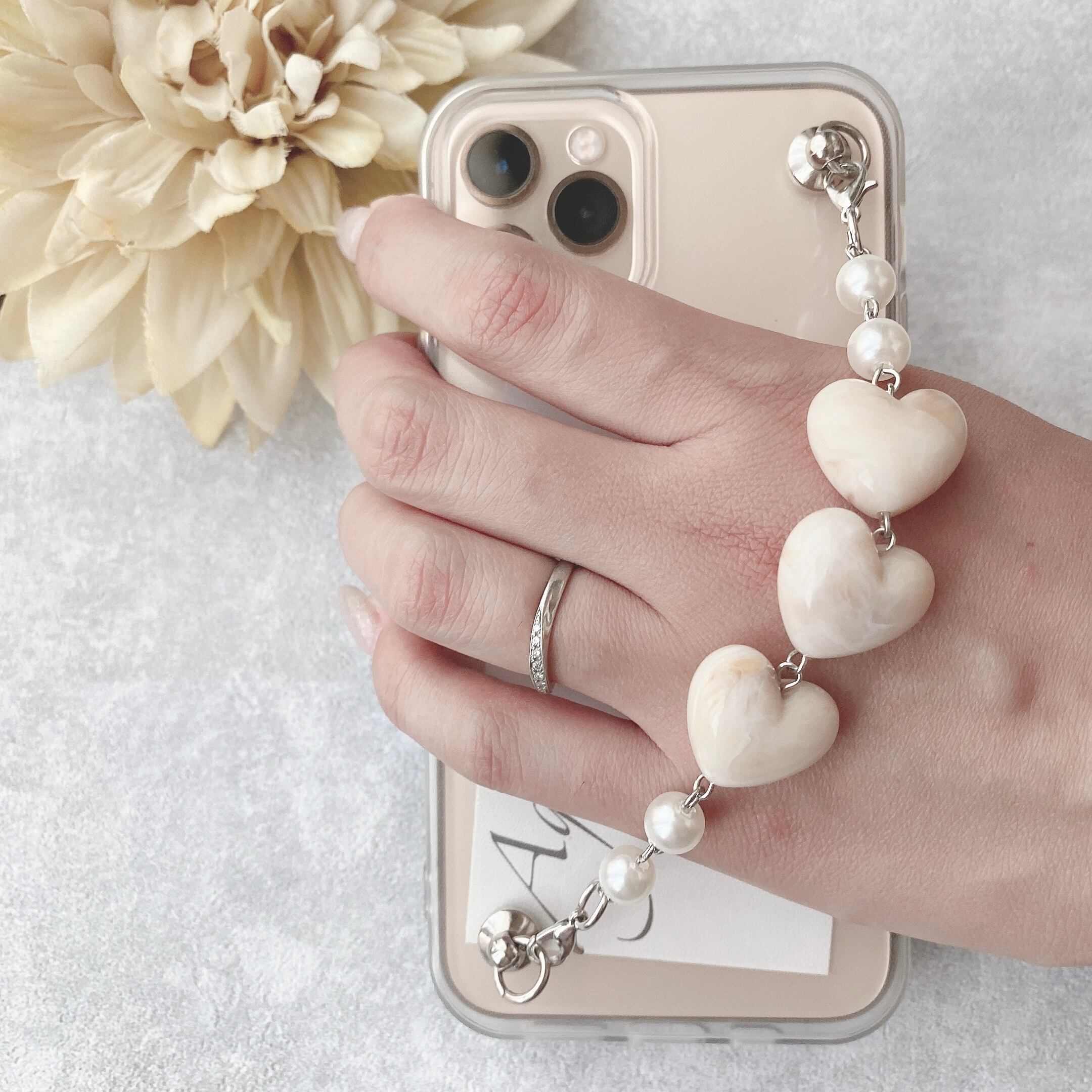 【iPhone】3連ハートのキーリングハンガー(オフホワイト×ベージュ)