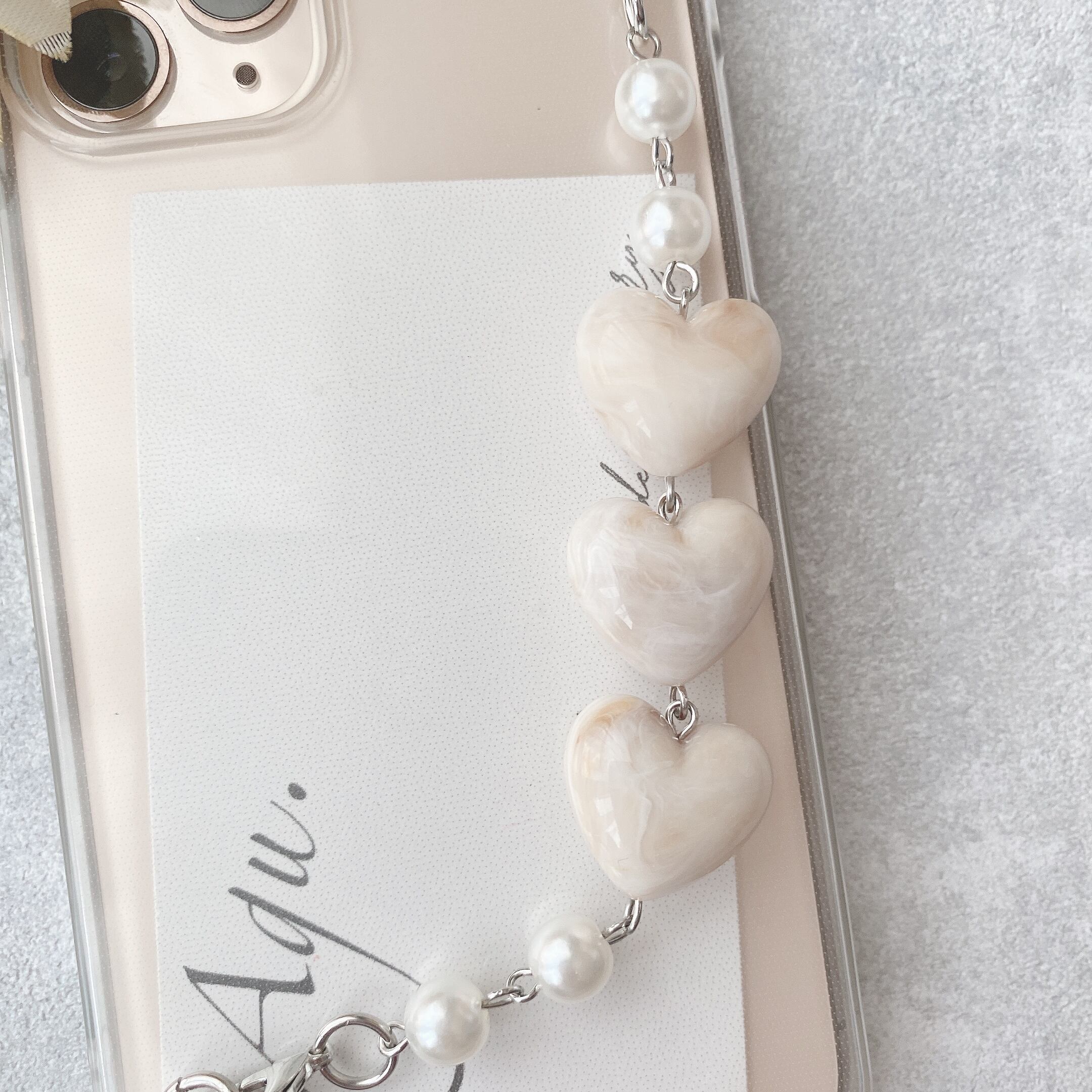 【iPhone以外】3連ハートのキーリングハンガー(オフホワイト×ベージュ)