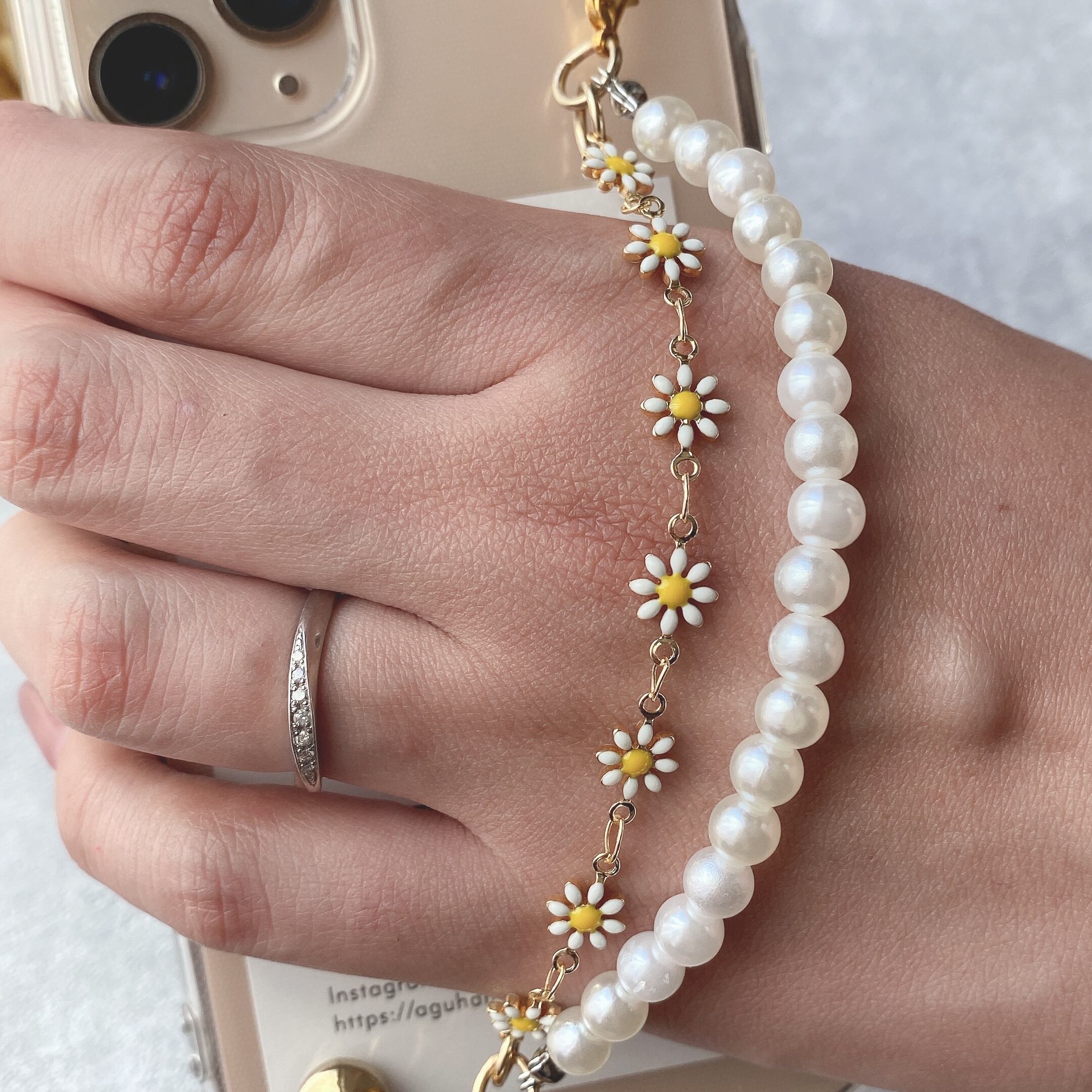 【iPhone】お花チェーンとパールのキーリングハンガー(ホワイト)