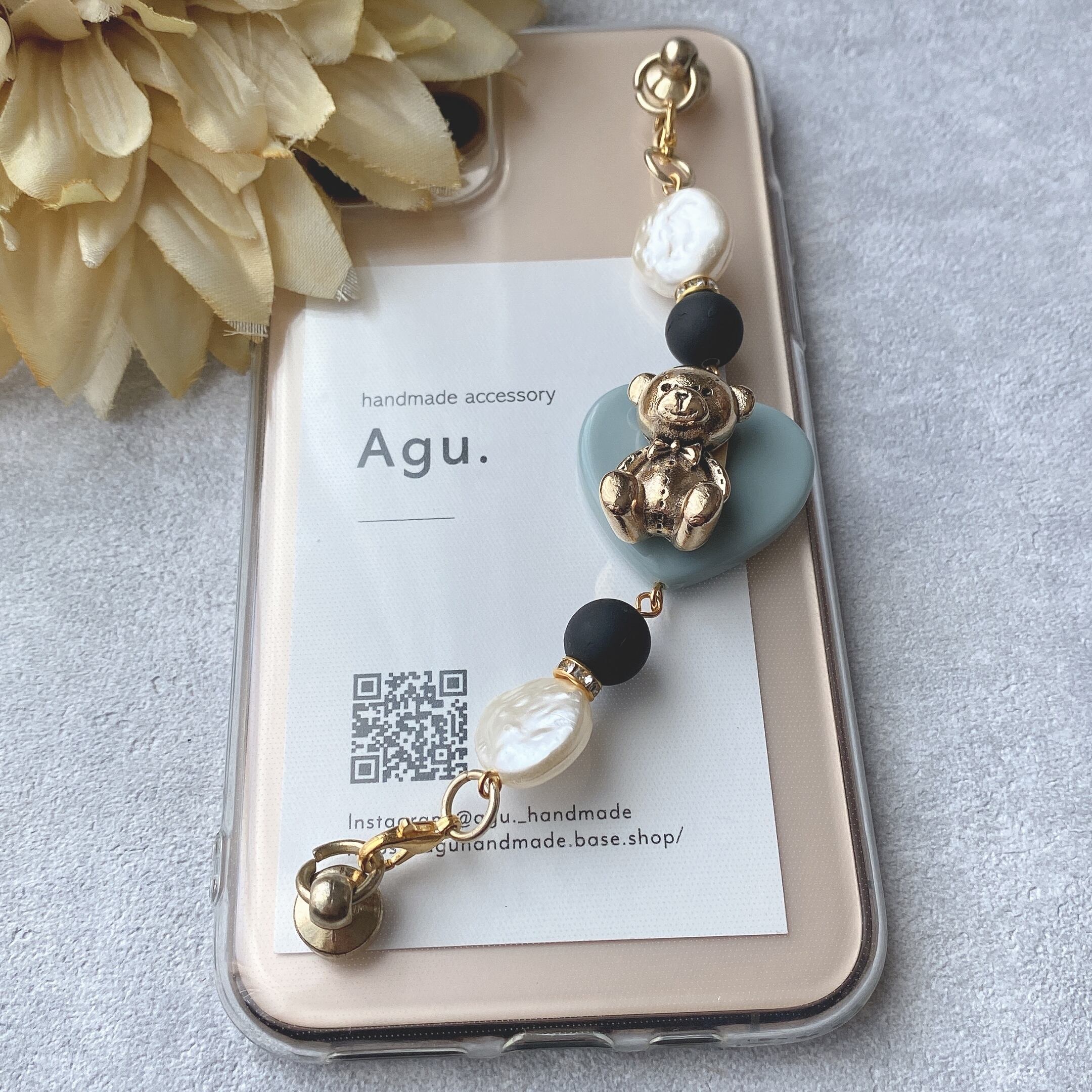【iPhone以外】ゴールドくまちゃんのキーリングハンガー(くすみブルー)