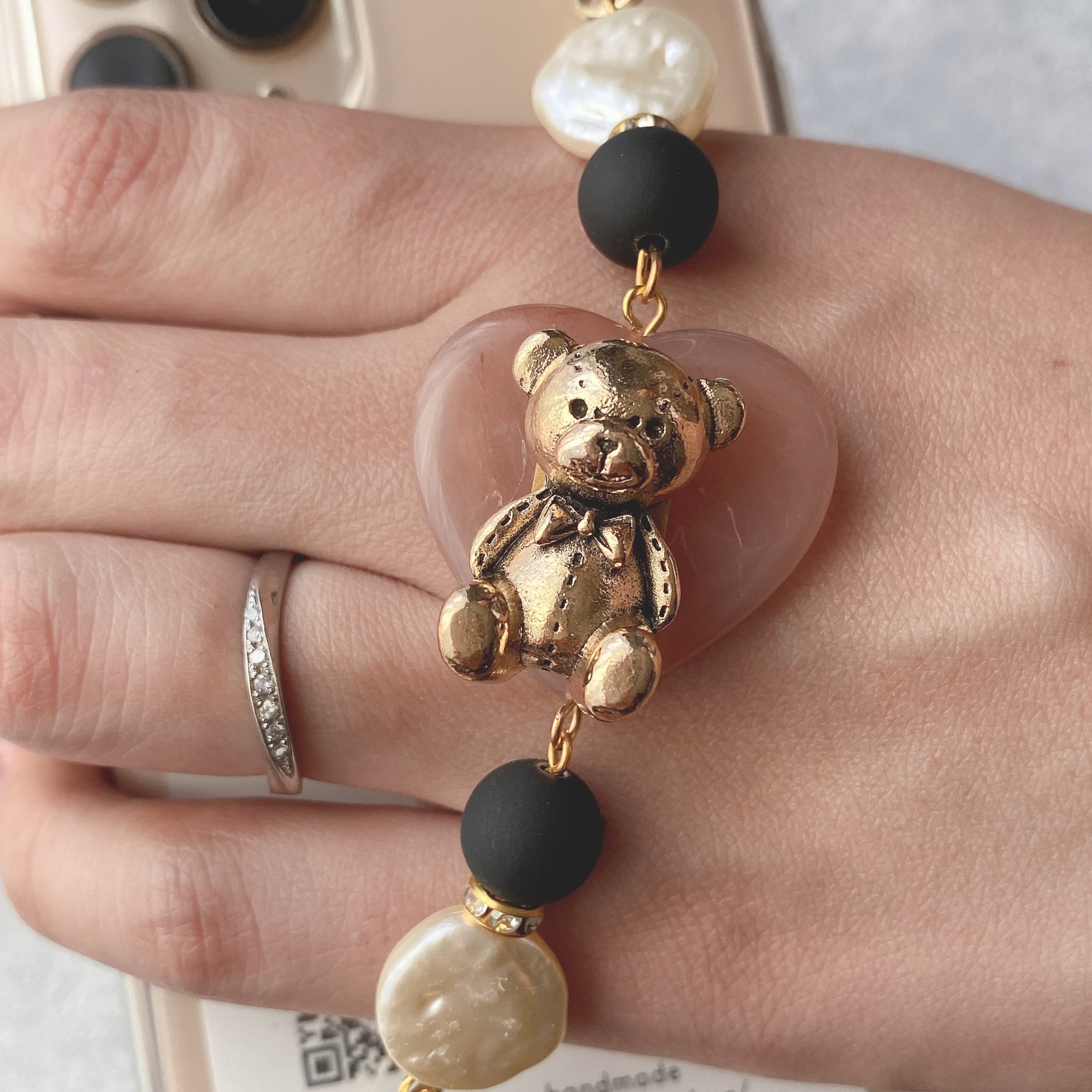 【iPhone以外】ゴールドくまちゃんのキーリングハンガー(ローズクォーツ)
