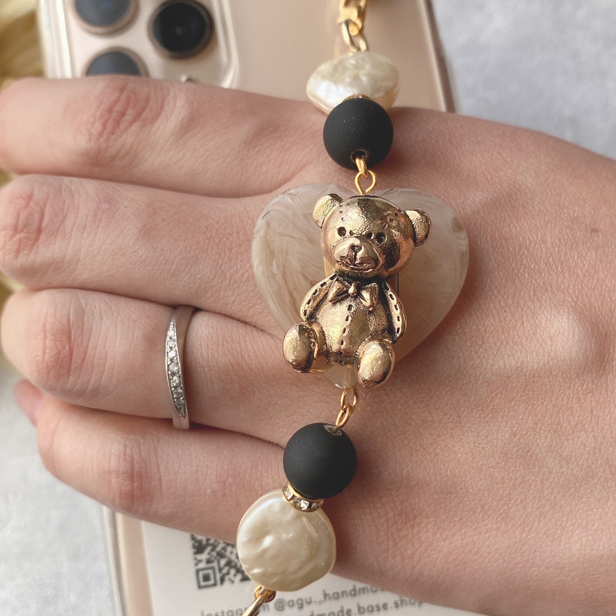 【iPhone以外】ゴールドくまちゃんのキーリングハンガー(ベージュマーブル)