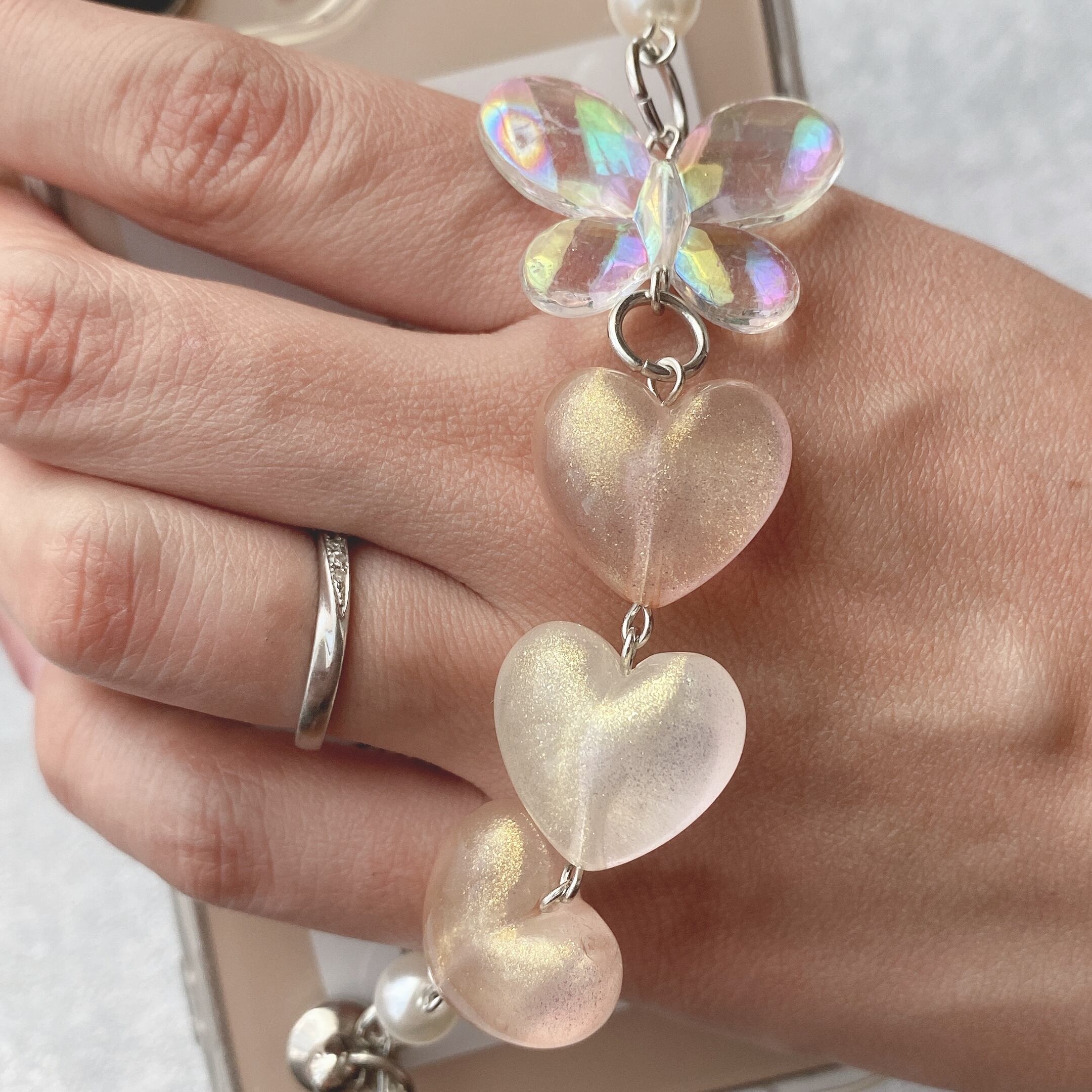【iPhone以外】オーロラ蝶々ときらきらハートのキーリングハンガー(パステルピンク)