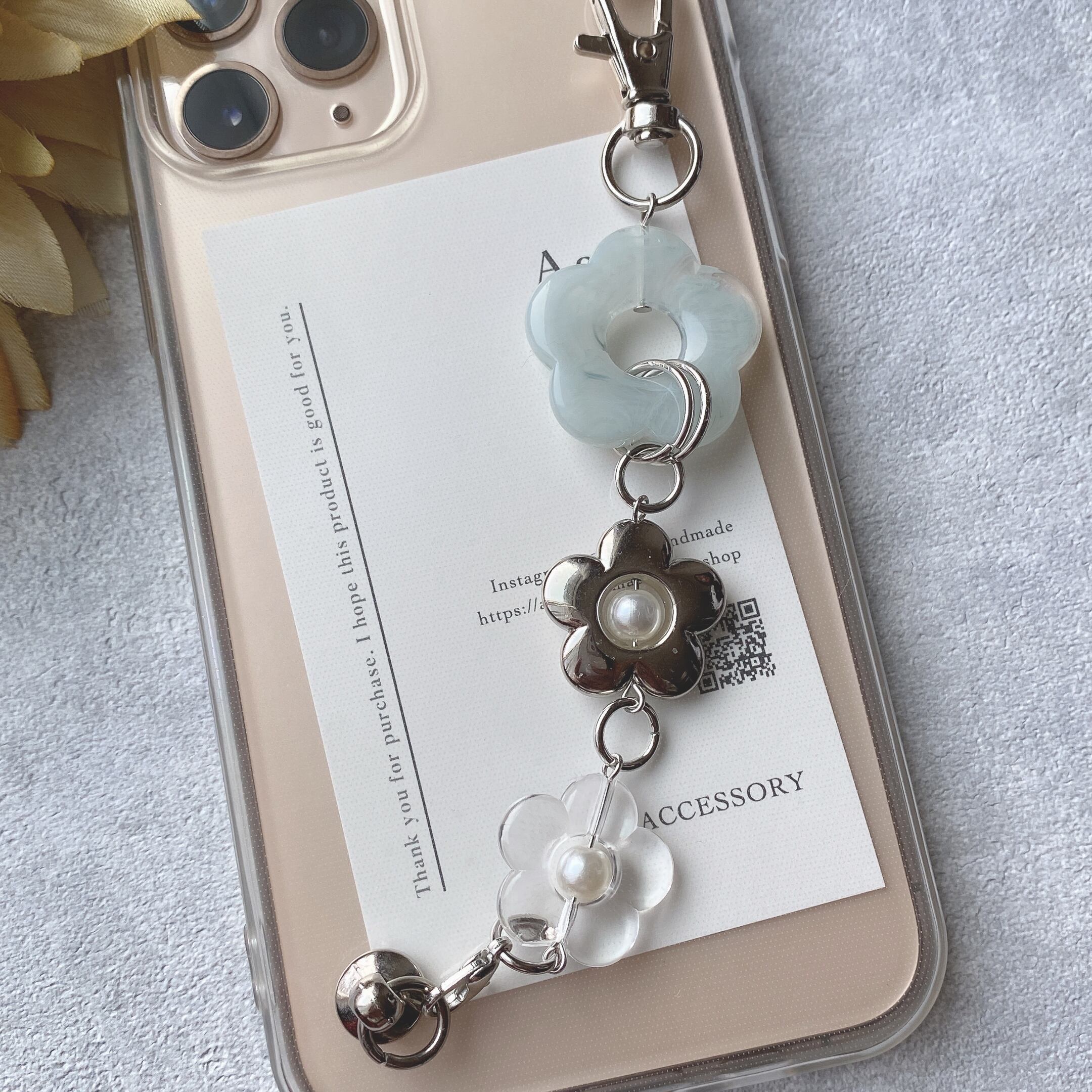 【iPhone以外】韓国っぽお花のキーリングハンガー(くすみブルー)