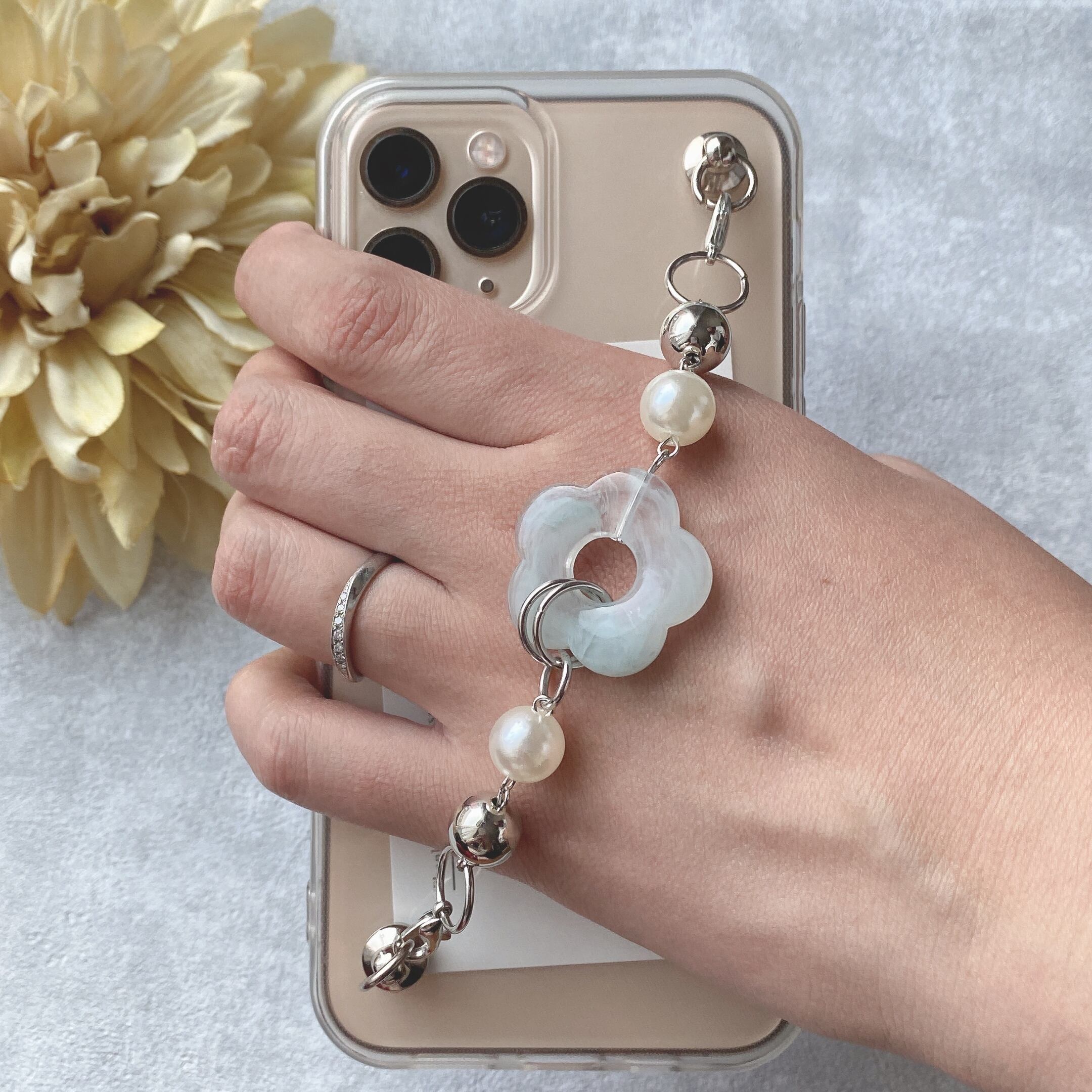 【iPhone以外】お花チェーンのキーリングハンガー(くすみブルー)