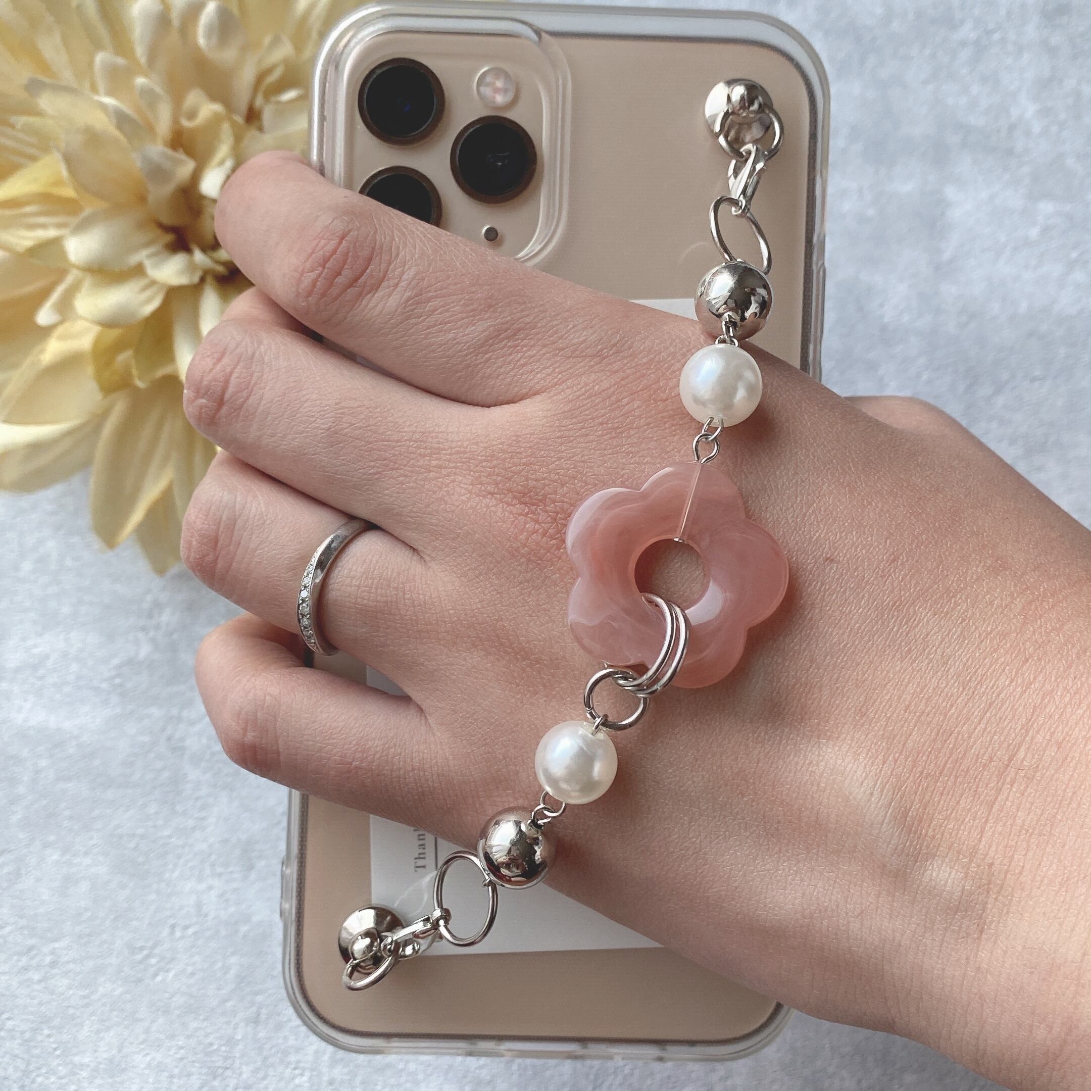 【iPhone】お花チェーンのキーリングハンガー(ローズクォーツ)
