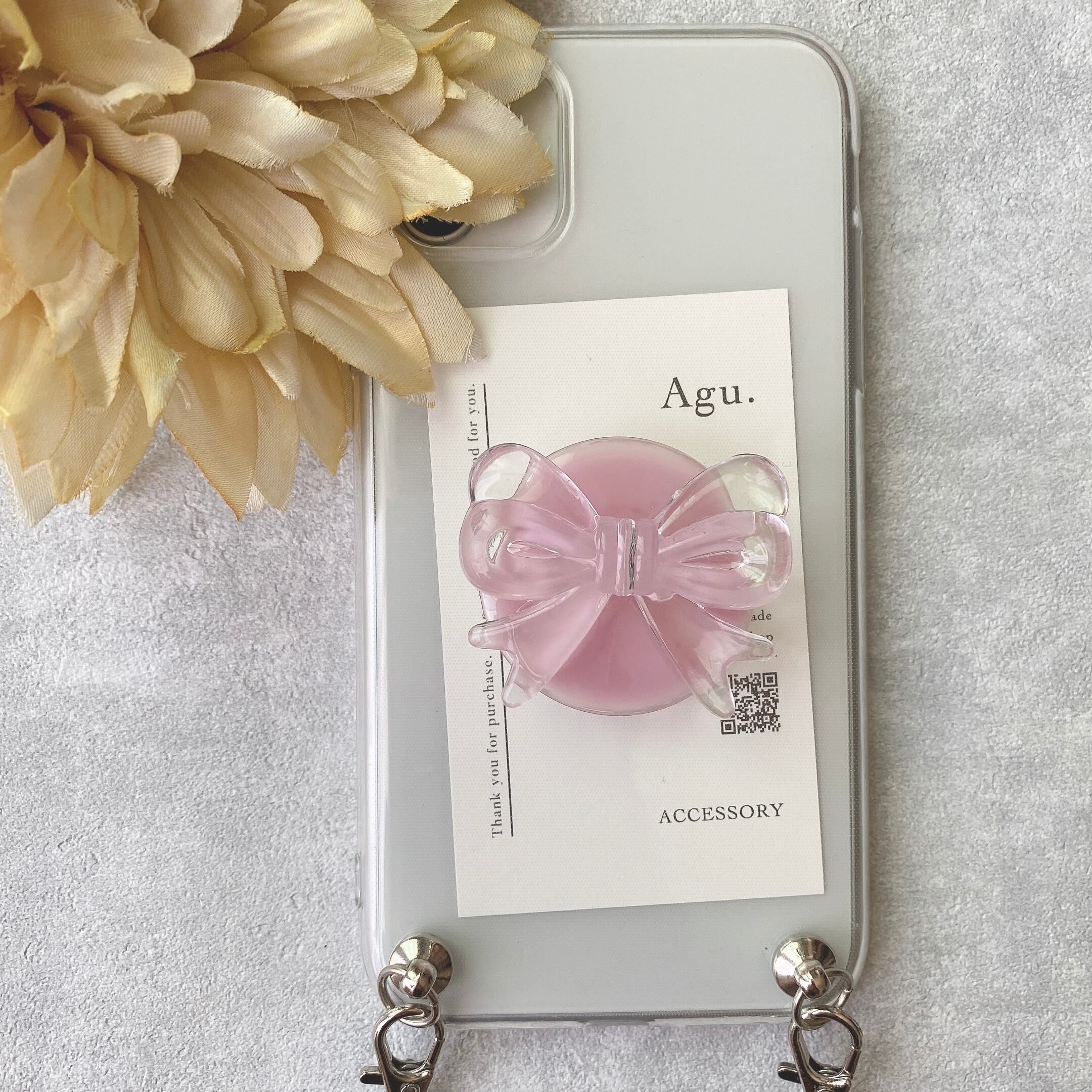 【iPhone】クリアリボンのグリップトックケース(くすみピンク)