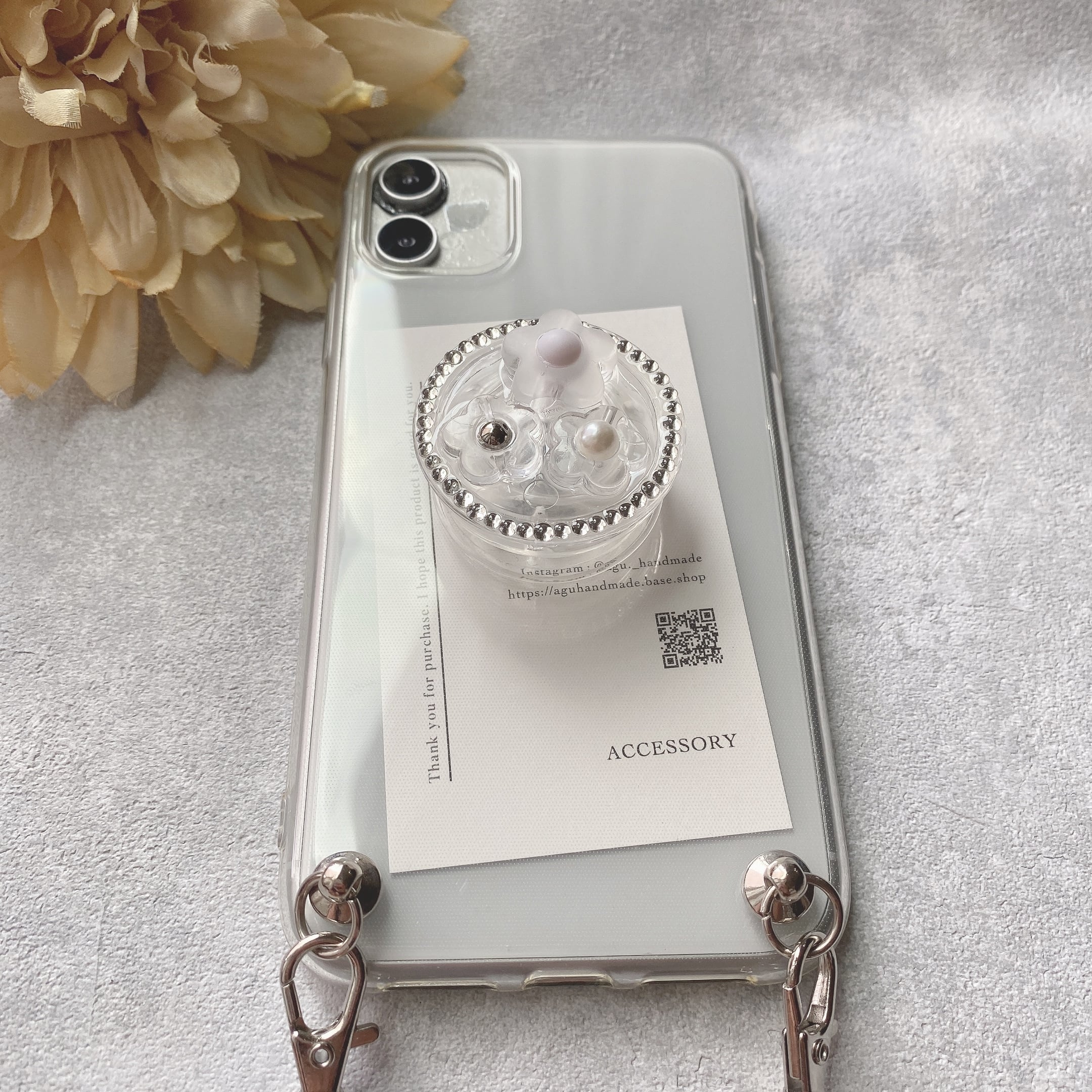 【iPhone】すりガラスフラワーのグリップトックケース(グレー)