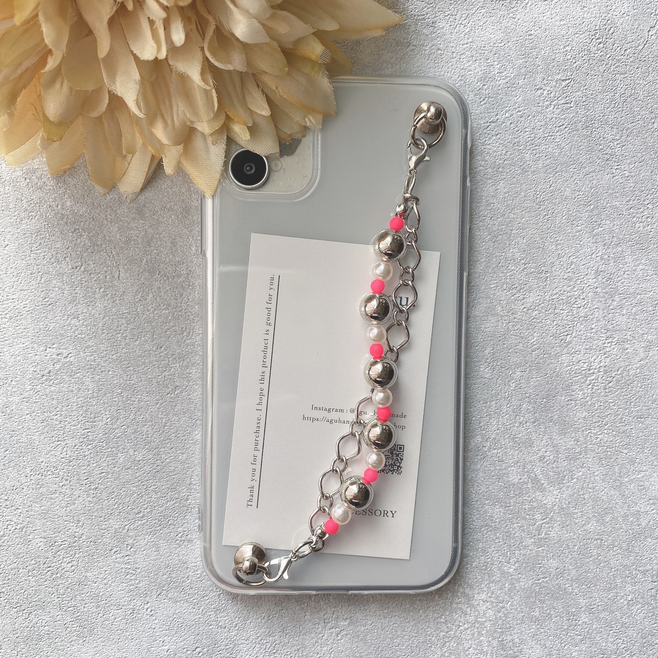 【iPhone】ネオンシルバーの2連キーリングハンガー(ピンク)