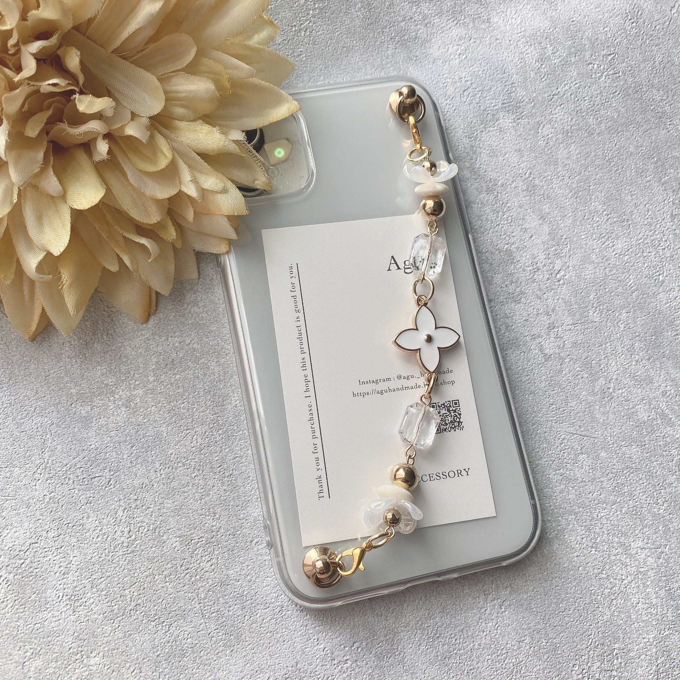 【iPhone以外】クリアビーズとお花のキーリングハンガー(ホワイト)