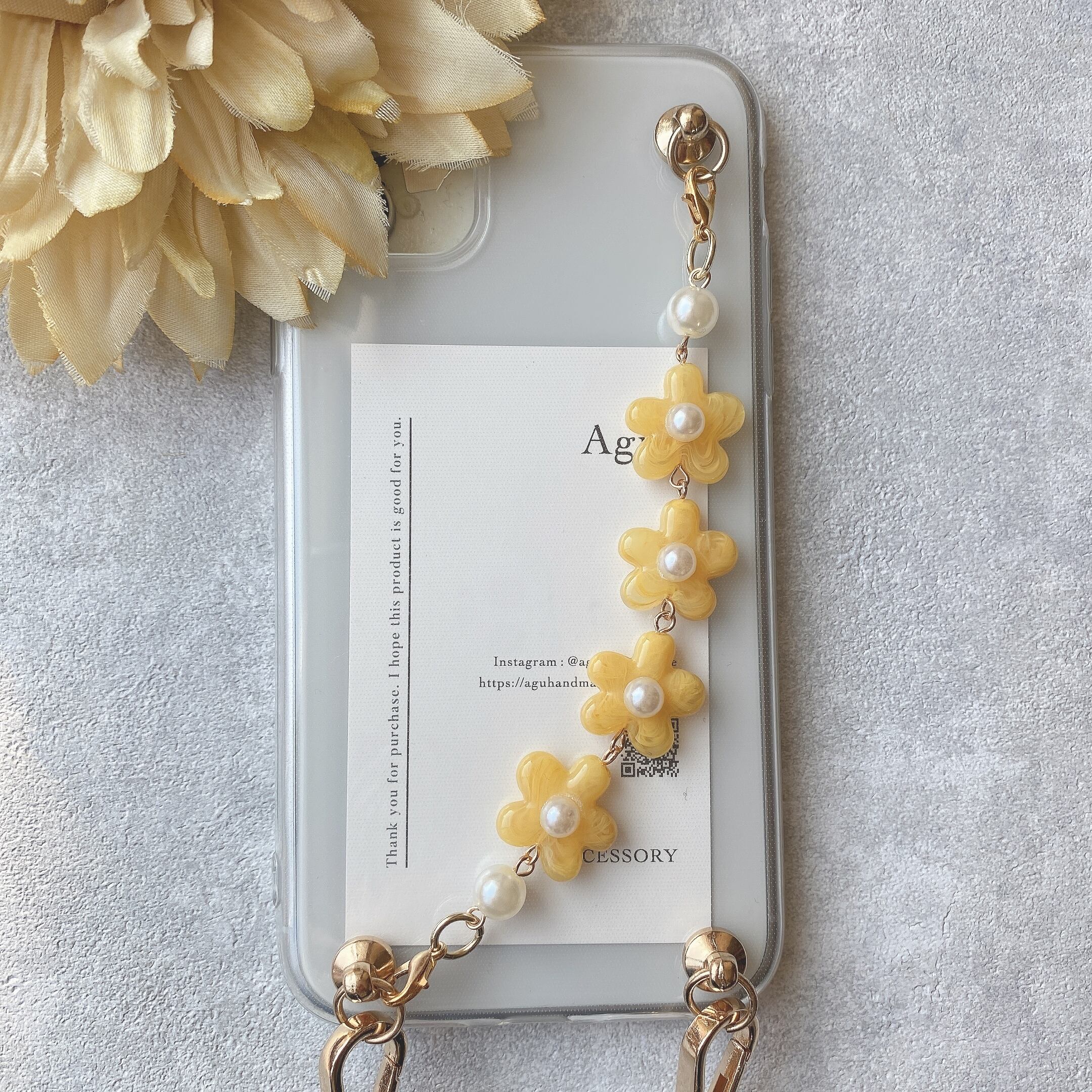 【iPhone以外】パールフラワーのキーリングハンガー(イエロー)