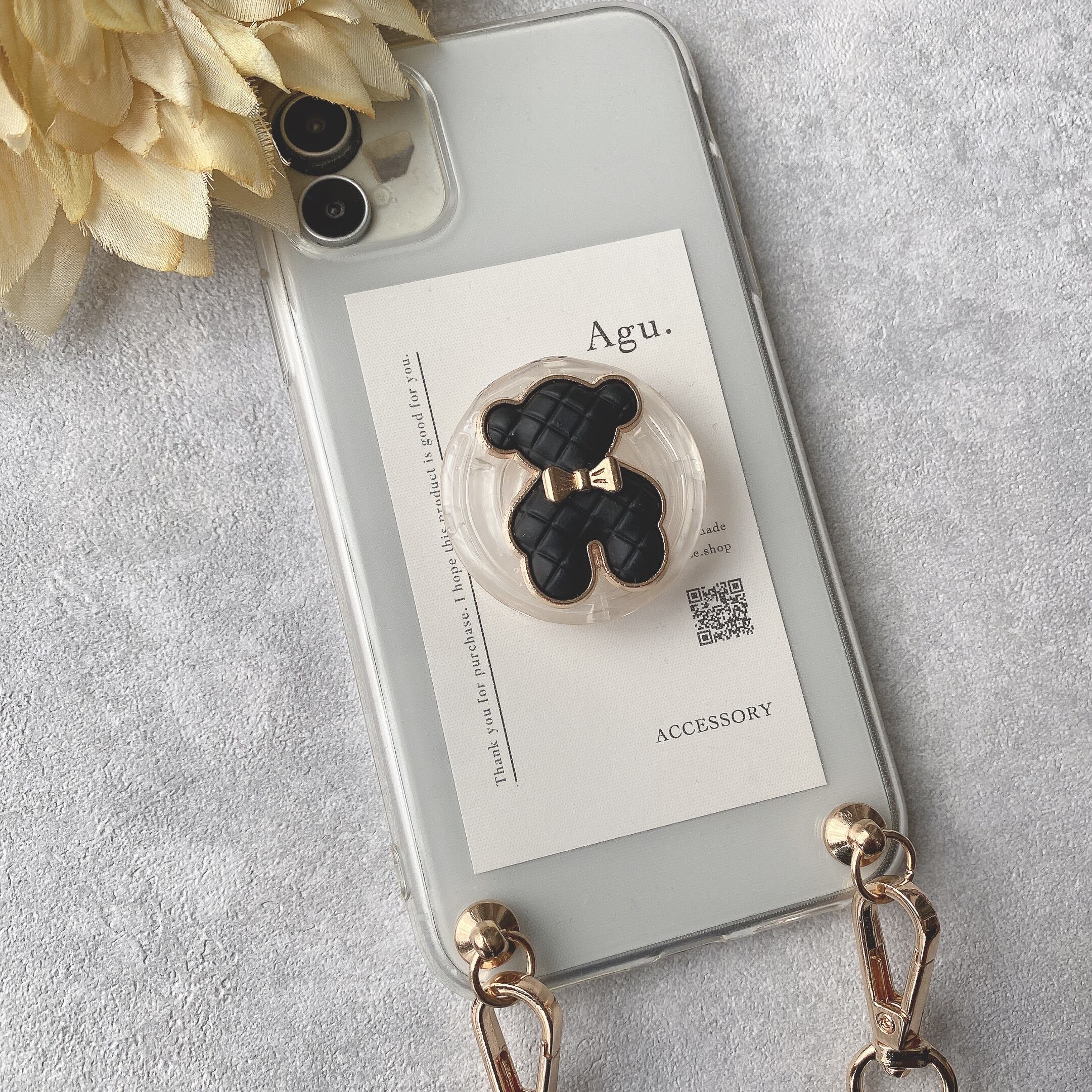 【iPhone以外】キルティング風くまちゃんのグリップトックケース(ブラック)